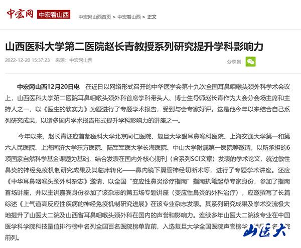 今年以來,趙長青還應首都醫科大學北京同仁醫院、復旦大學眼耳鼻喉科醫院、上海交通大學第一和第六人民醫院、上海同濟大學東方醫院、陸軍軍醫大學長海醫院、中山大學附屬第一醫院等邀請,以所承擔的6項國家自然科學基金課題為基。岷戲⒈碓詮諭夂誦鈉誑ê盜蠸CI文章)發表的學術論文,就過敏性鼻炎的神經免疫機制研究成果及其臨床轉化——鼻內鏡下翼管神經切斷術等,進行了專題學術講座。還應《中華耳鼻咽喉頭頸外科雜志》邀請,以全國“變應性鼻炎診療指南”指南執筆起草專家身份,參加了指南首場講座,并以主講嘉賓身份參加了該雜志的第五場專題講座(變應性鼻炎的外科治療),應邀撰寫了長篇綜述《上氣道高反應性疾病的神經免疫機制研究進展》在該專業雜志發表。其系列研究成果及學術交流極大地提升了山醫大二院及山西省耳鼻咽喉頭頸外科在國內的聲譽和影響力。連續多年山醫大二院該專業在中國醫學科學院科技量值排行榜中名列全國百名醫院榜單靠前,入選復旦大學全國醫院聲譽榜華北地區提名醫院前列。