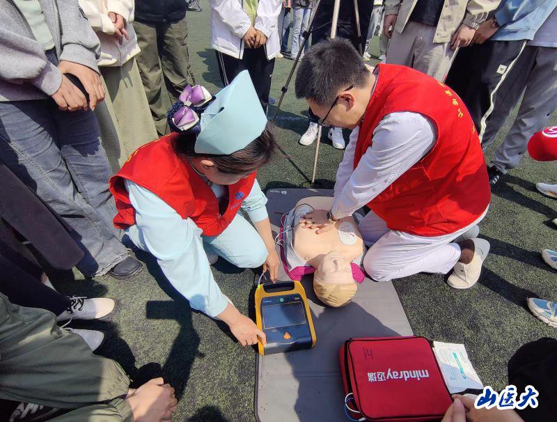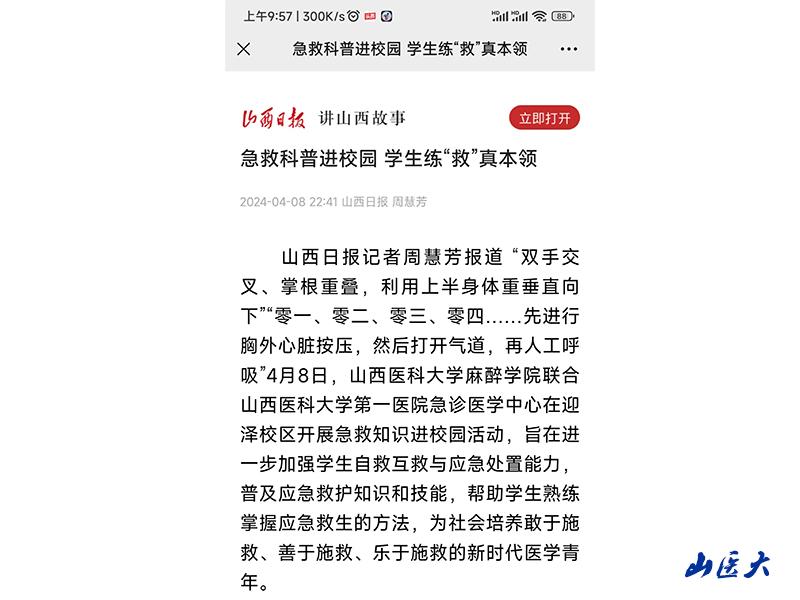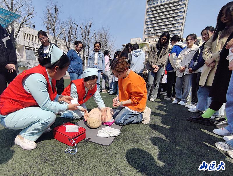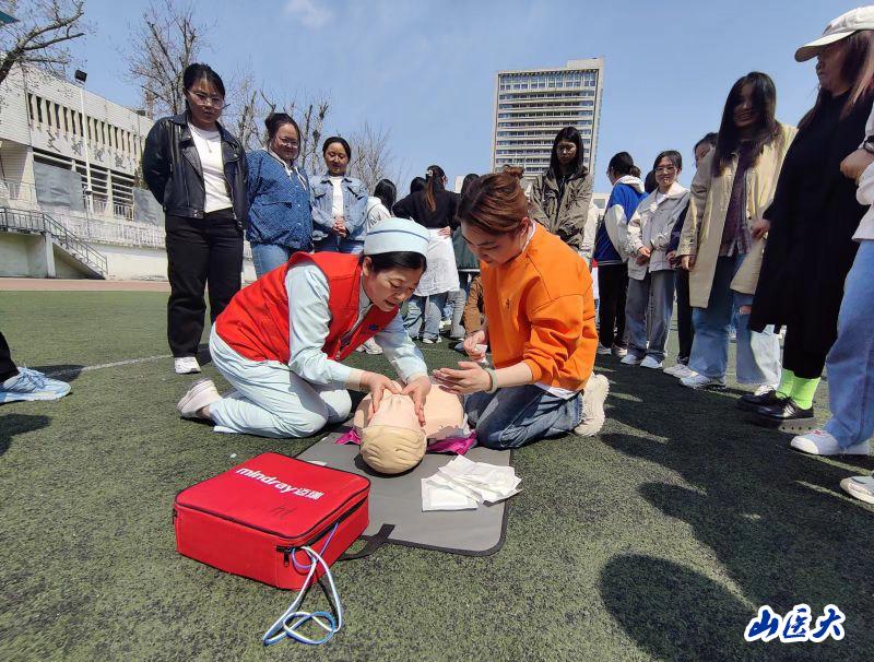 山西日報記者周慧芳報道 “雙手交叉、掌根重疊,利用上半身體重垂直向下”“零一、零二、零三、零四……先進行胸外心臟按壓,然后打開氣道,再人工呼吸”4月8日,c7c7.app麻醉學院聯合c7c7.app第一醫院急診醫學中心在迎澤校區開展急救知識進校園活動,旨在進一步加強學生自救互救與應急處置能力,普及應急救護知識和技能,幫助學生熟練掌握應急救生的方法,為社會培養敢于施救、善于施救、樂于施救的新時代醫學青年。
