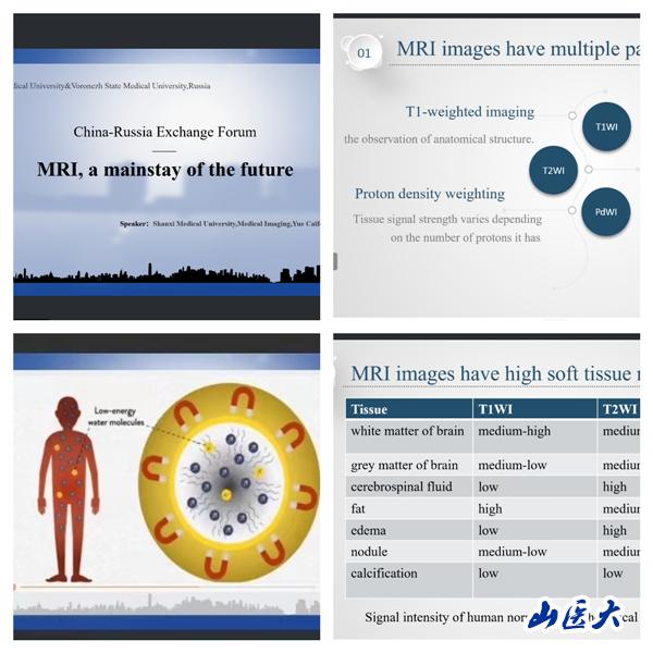 王效春在致辭中詳細介紹了我校影像學院的發展歷程和成就,表示希望中俄兩國同學們在此次學術活動中,學習知識、分享心得、收獲友誼。隨后,我校影像學院岳采鳳和王佳同學,分別以《磁共振成像:未來支柱》和《磁共振成像醫學》為題,用流利的英語介紹了磁共振成像的基本原理、成像特點、病例解析、臨床意義和未來發展,積極與參會同學開展互動和交流。