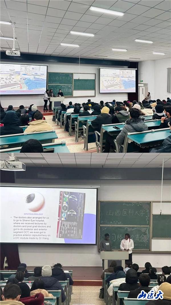學長學姐圍繞在第一臨床醫(yī)學院、第二臨床醫(yī)學院、第三臨床醫(yī)學院(山西省白求恩醫(yī)院)、第五臨床醫(yī)學院(山西省人民醫(yī)院)、山西省腫瘤醫(yī)院的實習和見習經歷展開了深入的交流分享。他們既介紹了各實習見習醫(yī)院的特點和管理要求、實習見習前要做的準備,也講述了自己在實習中的所見所聞,學習到的師生及醫(yī)患溝通技巧等體會感悟,鼓勵學弟學妹們要端正學習態(tài)度,嚴肅學習紀律,及早提升漢語水平,為未來的實習見習打下堅實的理論和語言基礎。