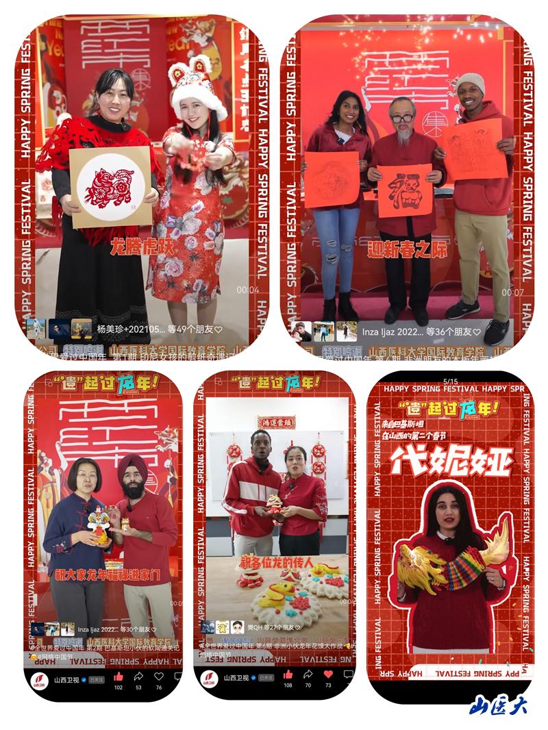 春節期間,在省委宣傳部和省教育廳國際處的指導下,我校國際教育學院與山西衛視融媒體攜手,拍攝“全世界愛過中國年”系列視頻,在山西衛視正月初一至初六期間連續播出,我校五位留學生在非遺傳承人的悉心教授下,學習了剪窗花、捏面塑、絳州木版年畫、做花饃、做糖畫,在山西多樣的非遺年俗里過龍年。