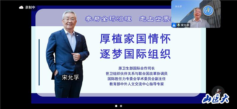 宋允孚首先以黨的二十大精神中“人類社會面臨前所未有的挑戰,積極參與全球治理體系改革和建設”為核心脈絡,以歷史上人類抗擊傳染性疾病的經典案例為引,深刻解讀國際合作的重要意義,生動展現中國在全球公共衛生事件應對中發揮的關鍵作用與突出貢獻。他強調,投身全球治理,既是時代賦予青年的使命,更是國家發展的必然要求,激勵在場學子勇擔時代重任。