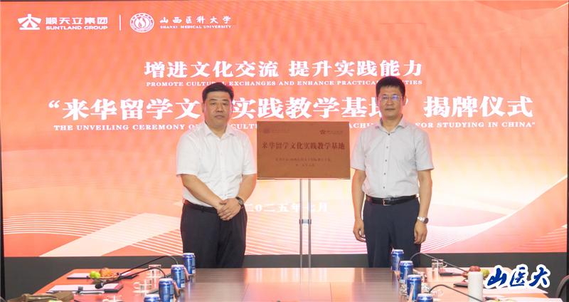 7 月 9 日,我校與山西順天立大健康產業集團有限公司共建的“來華留學文化實踐教學基地”舉行揭牌儀式。我校國際教育學院黨總支書記郭亞斌、副院長于曉霞及部分師生代表共同參加活動,山西順天立大健康產業集團有限公司董事長胡瑾瑜、太原市人民對外友好協會專職副會長楊永生出席。