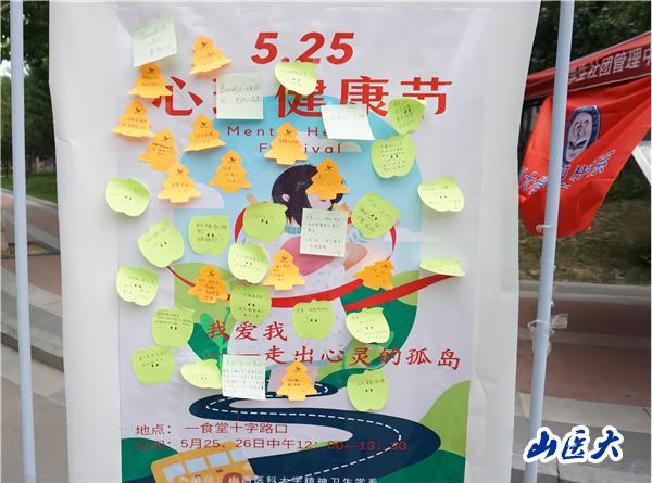 5月25日是大學生心理健康日,取自5.25的諧音“我愛我”,愛自己才能更好地愛他人,心理健康的第一條標準就是認識自我,接納自我,能體驗到自己存在的價值,樂觀自信。5月25-26日中午,學校精神衛生學系聯合第一醫院精神衛生科在中都校區第一食堂外開展了“快樂YES,焦慮NO”主題活動,旨在讓更多的同學走出心靈孤島,傾訴心中塊壘,學會接納自我。