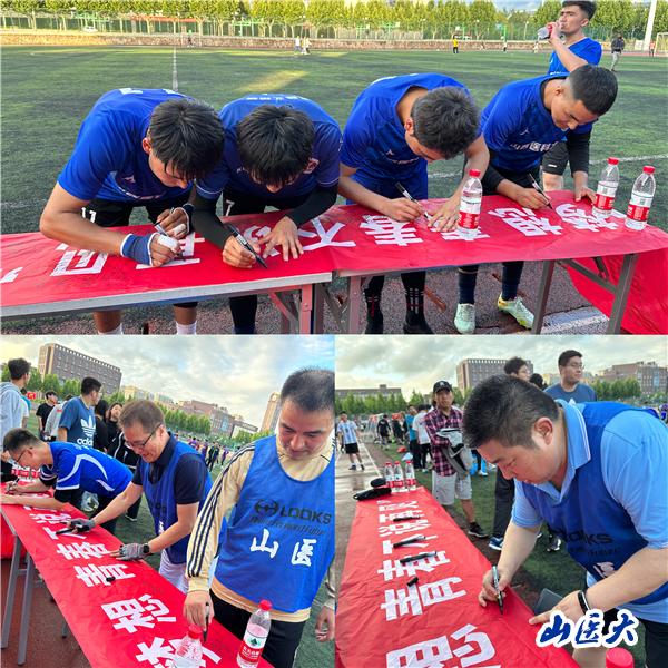 開賽前,法醫(yī)學(xué)院黨總支書記孫俊紅、教師代表哈利對(duì)23屆畢業(yè)生送上了最美好的祝福,畢業(yè)生代表哈木熱提感謝學(xué)校、學(xué)院以及校足球隊(duì)五年來的支持與關(guān)心,祝福學(xué)校人才輩出、桃李芬芳、蒸蒸日上。參加活動(dòng)的全體師生還共同合影,并在活動(dòng)宣傳條幅上簽名留念。