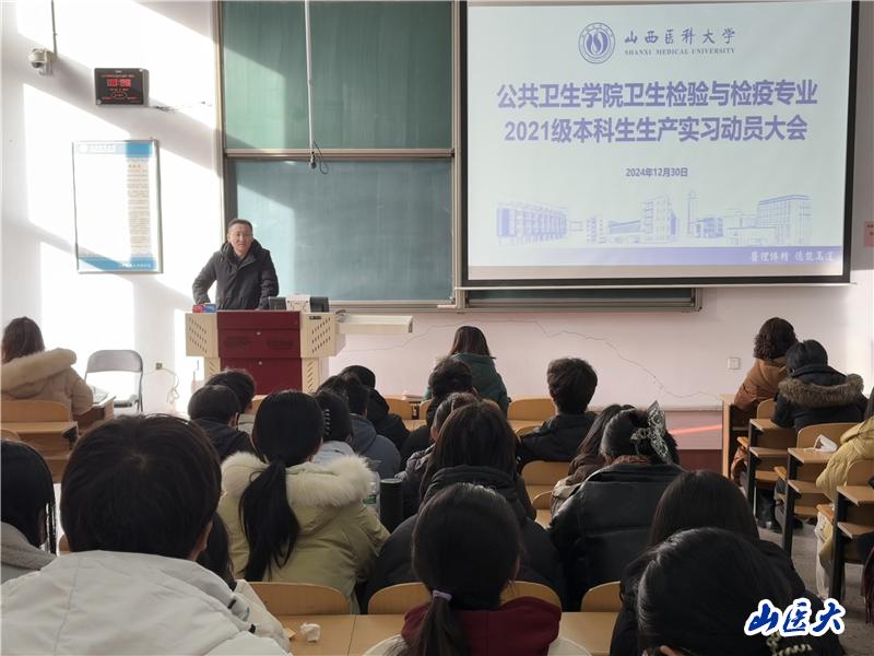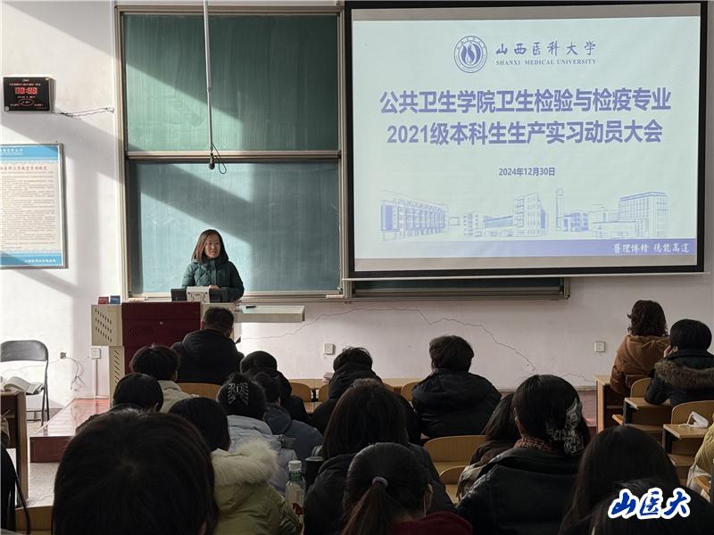 為扎實做好2021級衛(wèi)檢專業(yè)生產實習工作,引導學生明確實習目標,端正實習態(tài)度,12月30日上午,公共衛(wèi)生學院2021級衛(wèi)生檢驗與檢疫專業(yè)在中都校區(qū)召開生產實習動員大會。公共衛(wèi)生學院黨委副書記蔚鈺瓊、副院長聶繼盛出席并作動員講話,論文指導教師代表宋歡、王芳、教學秘書張蓉和2021級衛(wèi)檢專業(yè)全體學生參加。會議由思想政治輔導員張瑾主持。