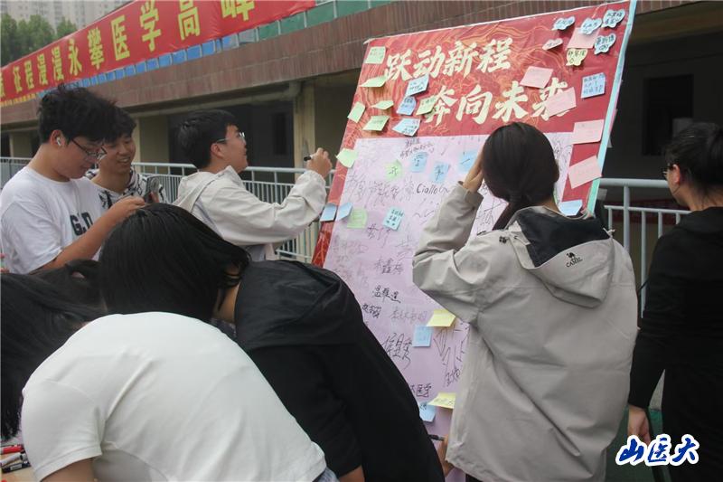 新生們在展板上留言,相互勉勵盡快適應新環境、奮勇前行,期許自己在新學期堅守初心、篤行不。∠遠暈蠢辭笱е返募岫ㄓ肴瘸。