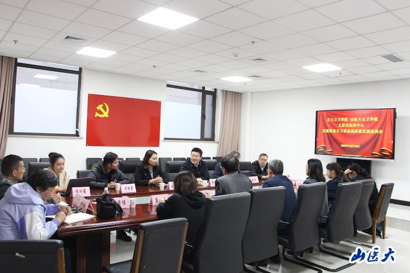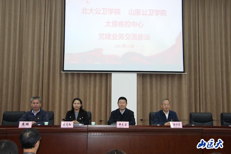 10月10日,高水平公共衛生學院黨建共同體成員單位北京大學公共衛生學院、我校公共衛生學院與太原市疾病預防控制中心開展黨建業務交流座談會。北京大學公共衛生學院黨委書記郝元濤、黨委副書記蘇鴻,太原市疾病預防控制中心黨委書記、主任徐計宏,黨委副書記錢月紅,副主任郝瑞崗、張萍,我校公共衛生學院黨委書記張志紅、副院長邱服斌、黨委副書記蔚鈺瓊、副院長宋歡等出席會議。來自各方的黨員代表共70余人參加了會議。