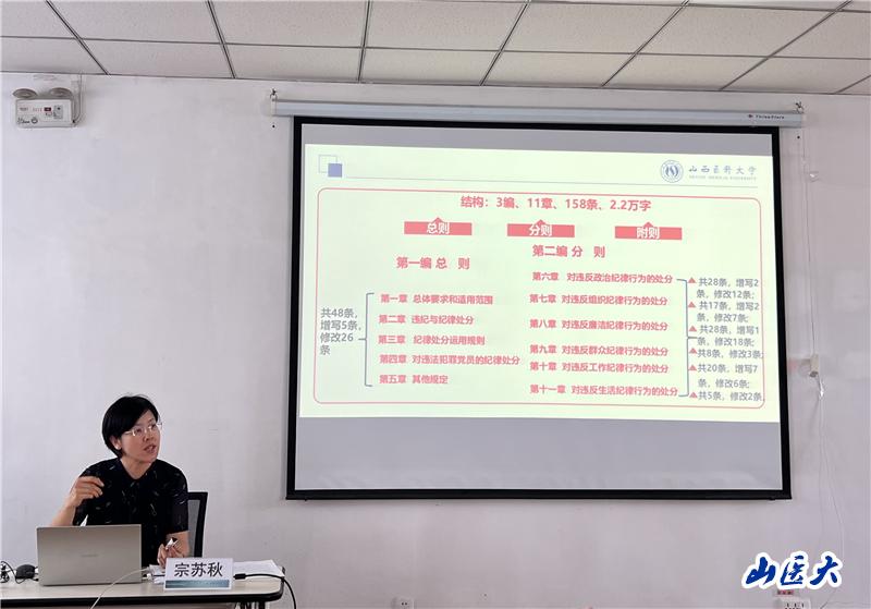 宗蘇秋對《中國共產黨紀律處分條例》中第六章內容“對違反政治紀律行為的處分”進行專題解讀。她介紹了《中國共產黨紀律處分條例》修訂背景及要求,闡述了六大紀律中最重要的紀律——政治紀律,通過剖析一個個鮮活的違紀典型案例,生動解讀了“政治攀附”“政治騙子”等新增及修改條例內容,以案說紀、以案說法,讓黨員、干部受警醒、明底線、知敬畏。