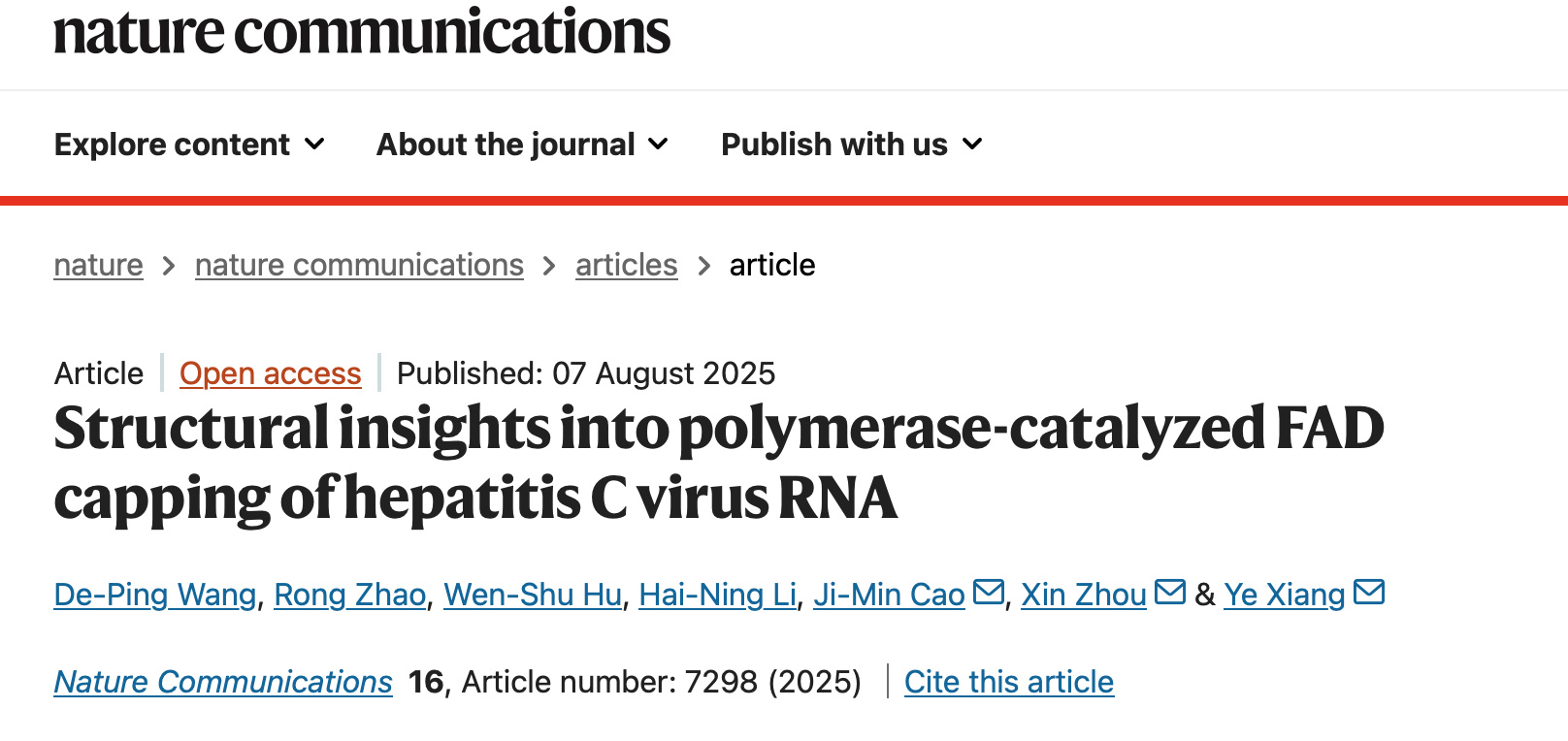 2025年8月7日,c7c7.app曹濟民/周鑫團隊與清華大學基礎醫學院/北京生物結構前沿研究中心向燁課題組合作在《自然-通訊》(Nature Communications)雜志在線發表了題為“Structural insights into polymerase-catalyzed FAD capping of hepatitis C virus RNA”的研究論文。該研究利用X射線晶體學技術,揭示了丙型肝炎病毒(HCV)RNA 5′端合成FAD帽的分子機制,為HCV 防治提供了新的理論補充。