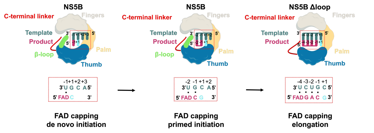 本研究解析了HCV RNA聚合酶NS5B以FAD作為起始核苷酸從頭合成RNA(de novo initiation)、引物引發(primed-initiation)以及延伸狀態下(elongation)的復合物結構。通過對這些復合物結構分析,以及一系列生化研究證據,表明引發元件PE的β loop中氨基酸殘基M447和Y448直接與FAD的核糖醇基團相互作用,是NS5B起始階段特異性識別FAD的關鍵元素。此外,FAD的腺嘌呤基團與HCV 基因組3′端的尿嘧啶形成堿基互補配對,是其被添加在不同基因型負鏈RNA(-RNA)5′末端的決定因素。進一步分析發現,在HCV RNA加FAD帽的延伸階段,NS5B的C端linker中的W550與FAD的異咯嗪環相互作用,穩定了5′端的FAD帽結構。這種相互作用進一步誘導了產物鏈的構象變化,形成了一種尚未被觀察到的、獨特的RNA雙鏈延伸中間態,利于RNA雙鏈以不對稱的運動模式進行延伸(圖1)。本研究不僅為開發靶向HCV 的新型治療藥物提供了理論指導,同時由于FAD非典型帽有幫助逃避宿主免疫的功能,這一性質也可能被應用于開發新型mRNA 修飾方法,助力mRNA疫苗及治療性藥物的發展。
