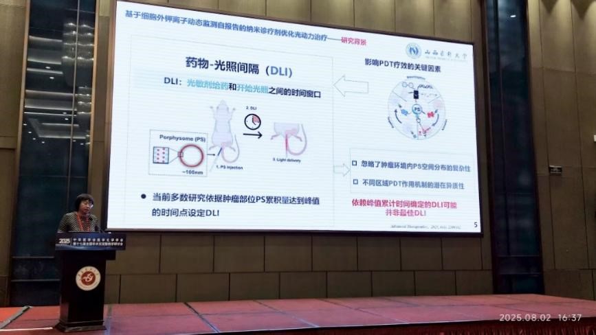 中華醫(yī)學會醫(yī)學化學學會理事、c7c7.app卞偉教授應邀作大會特邀報告。報告中,卞偉教授詳細介紹了c7c7.app納米醫(yī)學創(chuàng)新團隊的核心研究成果—一種細胞死亡自我報告光動力診療納米劑。該納米劑通過利用細胞外鉀離子穩(wěn)態(tài)異常作為細胞死亡的直接生物標志物,能夠精確地原位評估治療效果和動態(tài)優(yōu)化藥物-光照間隔(DLI)。研究通過從靜態(tài)蓄積驅(qū)動向動態(tài)響應引導的治療策略轉(zhuǎn)型,建立了光動力療法的變革性范式。這一創(chuàng)新性研究成果引發(fā)了與會專家的廣泛關(guān)注和熱烈討論。