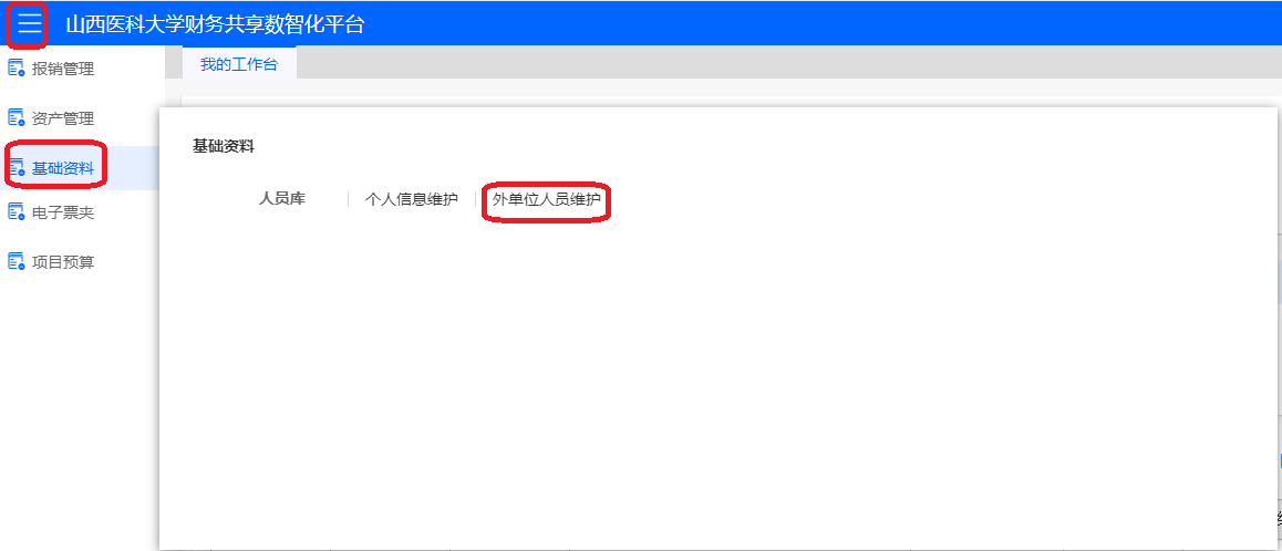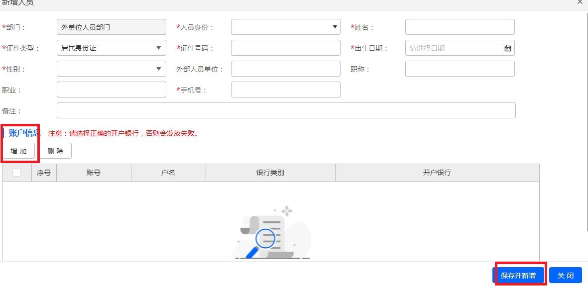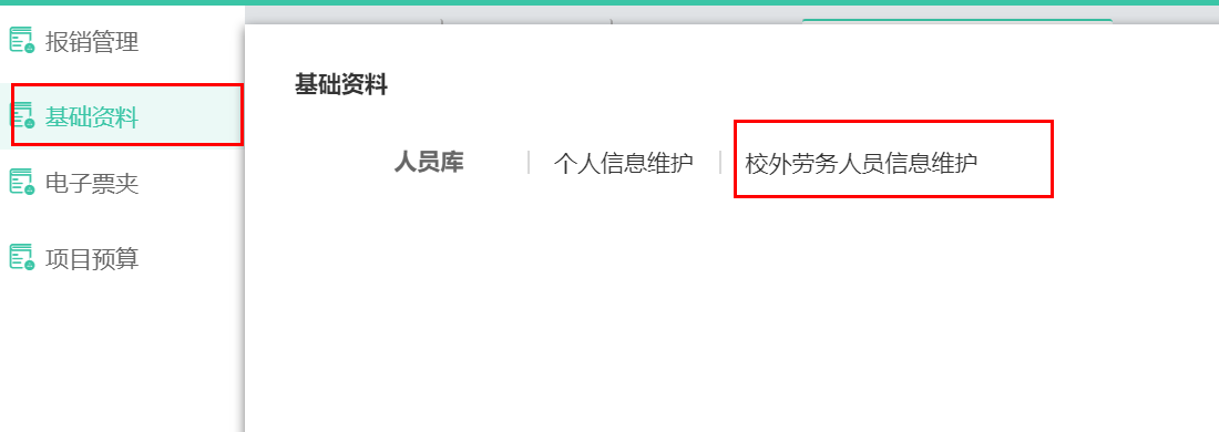 點擊左側菜單欄中【基礎資料】—【校外勞務人員信息維護】,可新增校外人員基本信息,用于酬金報銷。