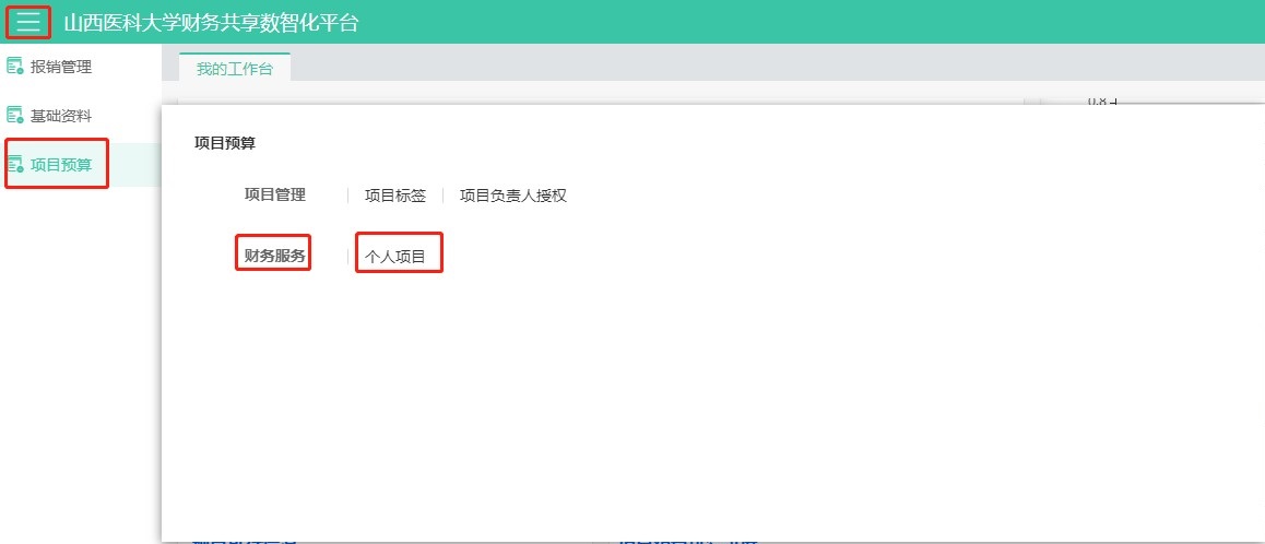登錄后,在左側菜單列表中,點擊【項目預算】-【財務服務】-【個人項目】。