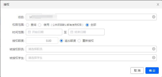 1. 項目負責人可授權給多個職員或學生查詢或使用項目,【查詢】權限僅限于被授權人查詢項目執(zhí)行情況,【使用】權限僅限于被授權人填單報銷。