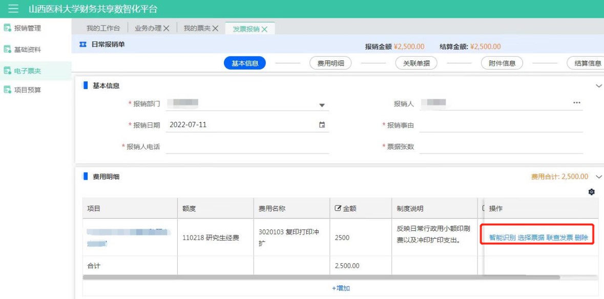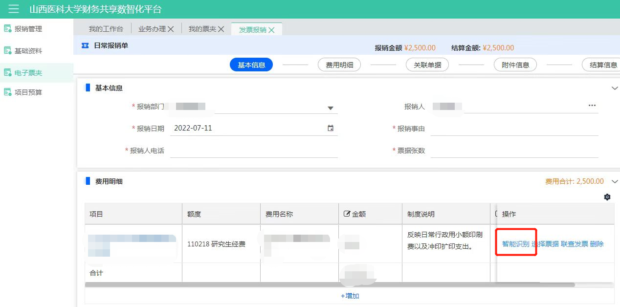 進入報銷單,選擇項目費用明細后,點擊【智能識別】按鈕,進入智能識別頁面。