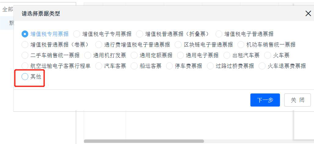 如果有除以下目錄中的票據(jù)請點擊【選擇票據(jù)】--【手工錄入】,選擇其他類型票據(jù)添加發(fā)票信息即可。