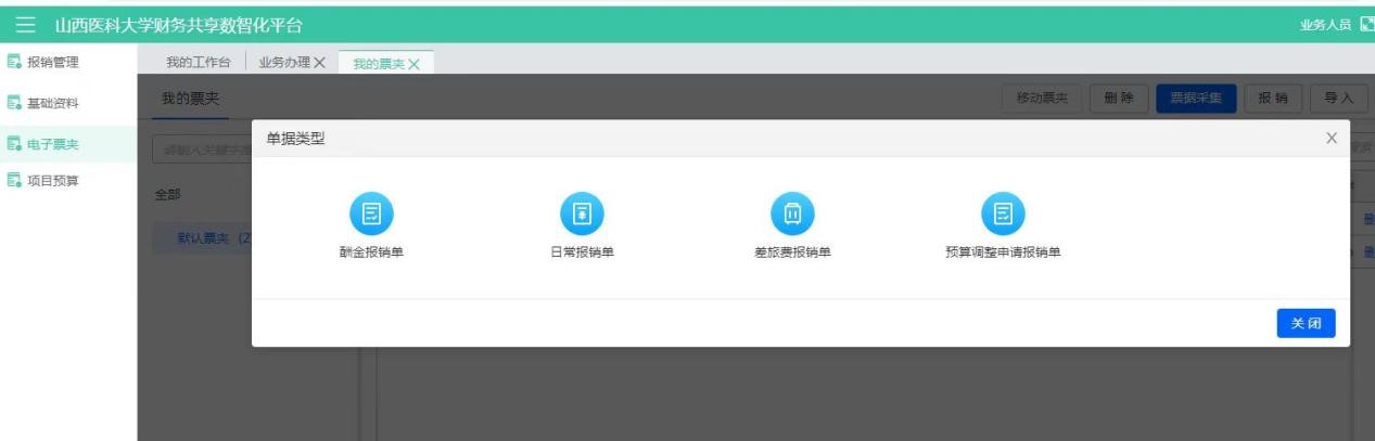 建議使用電子票夾采集保存后直接在報銷單中選擇票據(jù)進行報銷,不建議從電子票夾里點報銷。