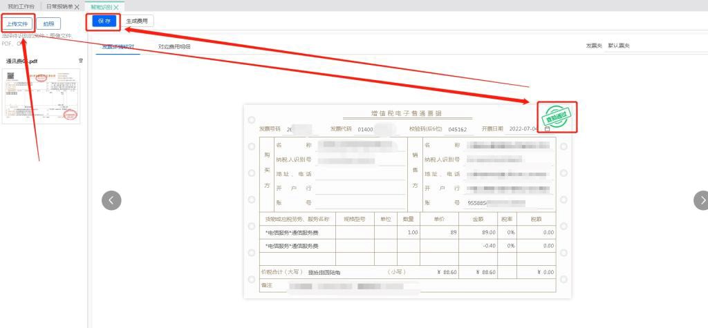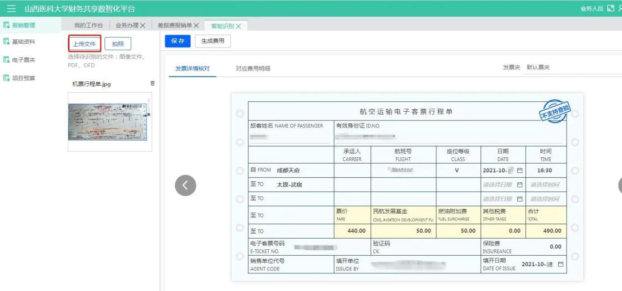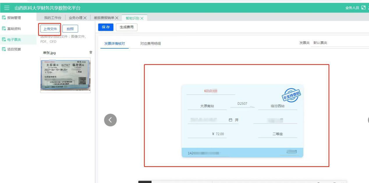 點擊【智能識別】--進入頁面后點擊【上傳文件】,查驗通過后點擊【保存】(電子發(fā)票必須上傳原件,識別確認無誤,折疊票等紙質發(fā)票可能存在印章遮擋檢驗碼等情況造成查驗失敗,火車票和機票行程單必須上傳單次行程票據(jù))如圖: