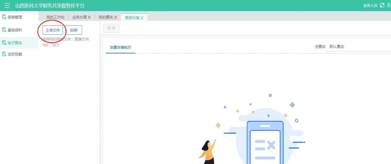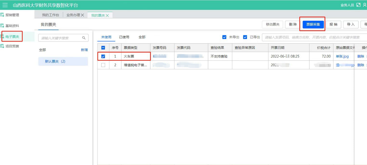 點擊電子票夾--【票據(jù)采集】,上傳所報銷的票據(jù),點擊保存后勾選要報銷的票據(jù)--【報銷】