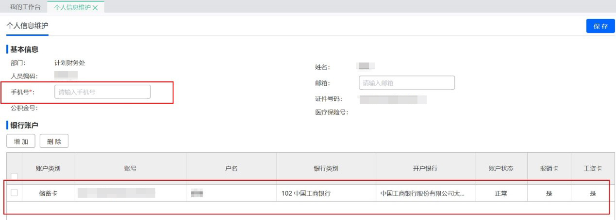 點擊左側菜單欄中【基礎資料】—【個人信息維護】,可對銀行賬戶、郵箱、聯(lián)系方式等個人信息進行修改。