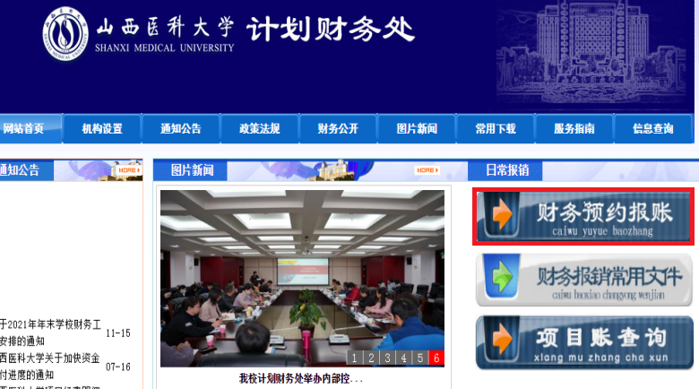 第二種:通過【c7c7.app官網首頁】-【管理機構】-【行政部門】-【計劃財務處】,進入c7c7.app計劃財務處網站主頁,點擊右側的【財務預約報賬】進入系統(tǒng)