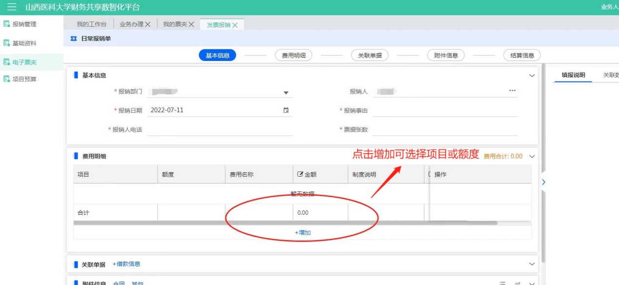跳轉至報銷單,修改費用明細并添加項目額度進行填報。