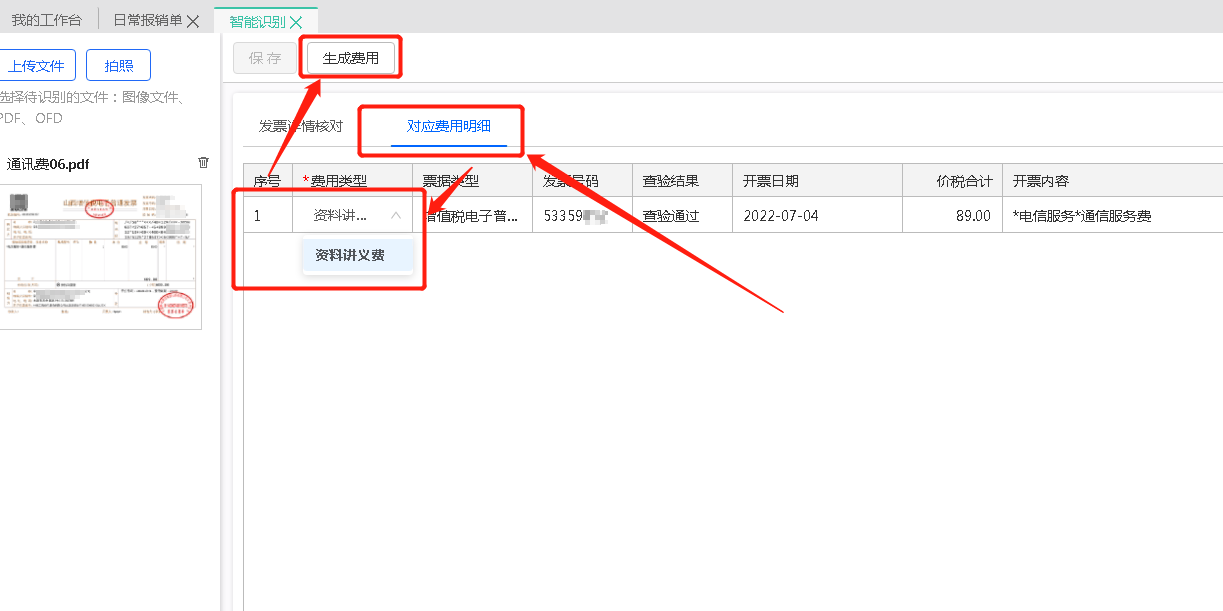 保存后需點擊對應費用明細,選擇費用類型,完成后點擊生成費用即可(正在簡化該流程,上傳保存后直接點擊生成費用即可)。