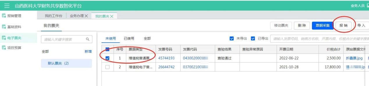 保存后退出從我的票夾中找到剛剛查驗過的發(fā)票,勾選后點擊【報銷】。