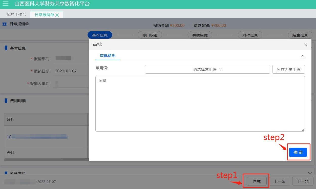點擊右下角【同意】—【確認】,確認需要報銷的單據(jù),如圖: