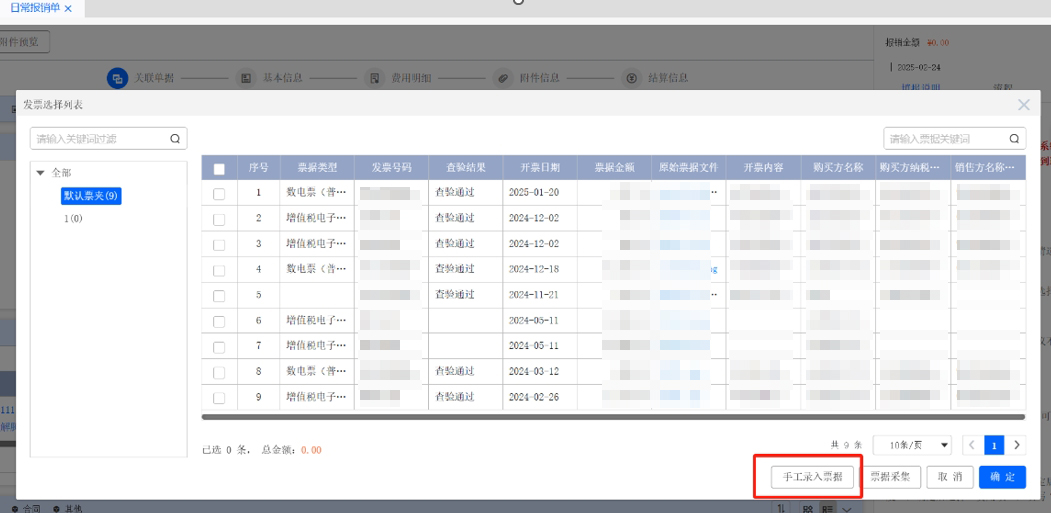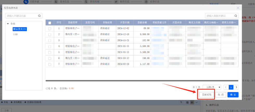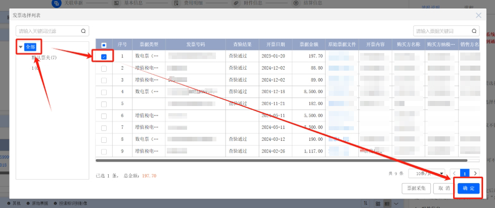 保存后關(guān)閉票據(jù)采集頁面,回到報(bào)銷單中的發(fā)票選擇列表中,點(diǎn)擊全部刷新頁面,勾選識別后的發(fā)票,點(diǎn)擊確定即可完成發(fā)票關(guān)聯(lián)。