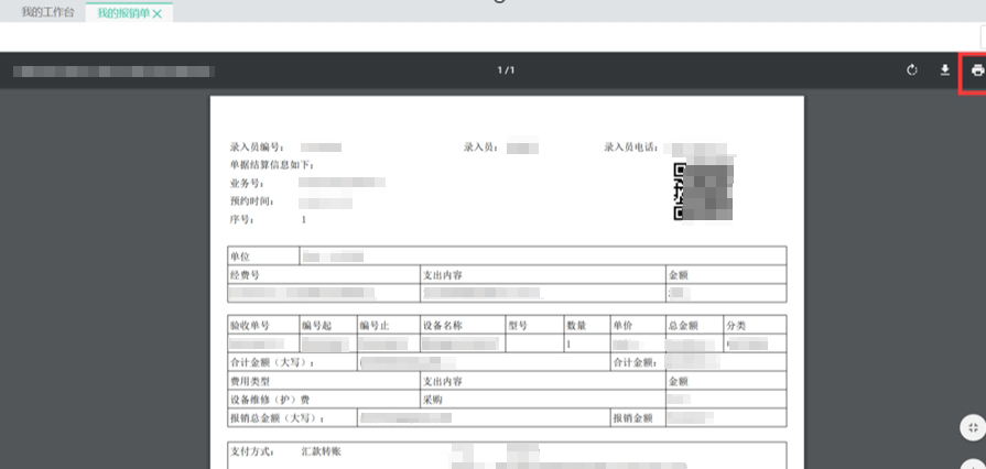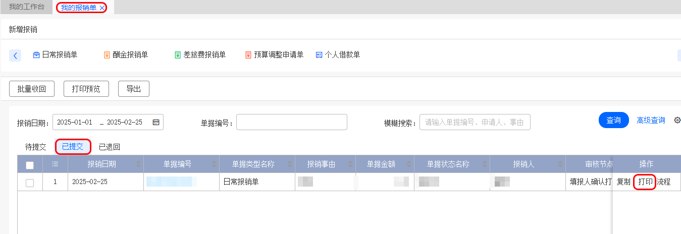 此時(shí),在“我的報(bào)銷單”→“已提交”的單據(jù)中,就可以進(jìn)行打。繽: