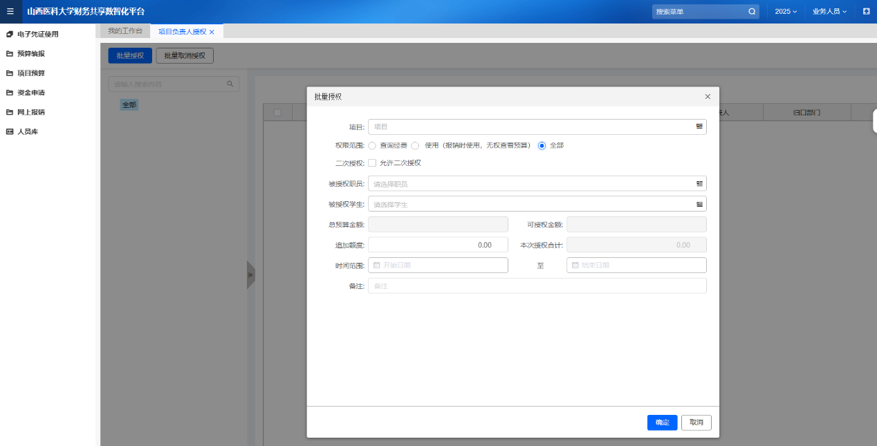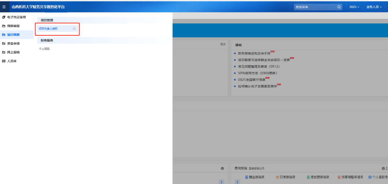 登錄后,在左側(cè)菜單列表中,點(diǎn)擊“項(xiàng)目預(yù)算”→“項(xiàng)目負(fù)責(zé)人授權(quán)”。