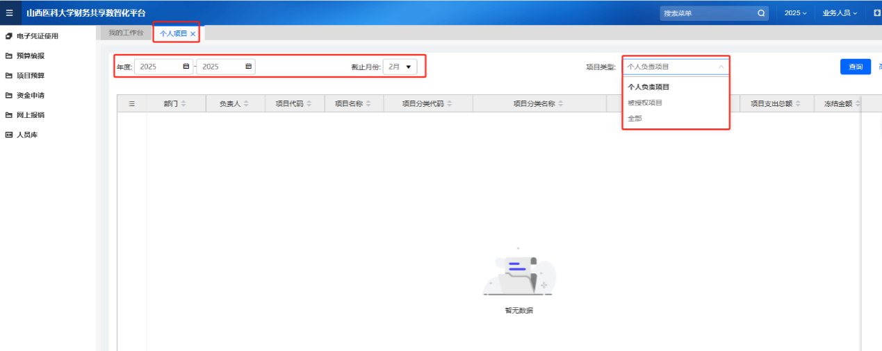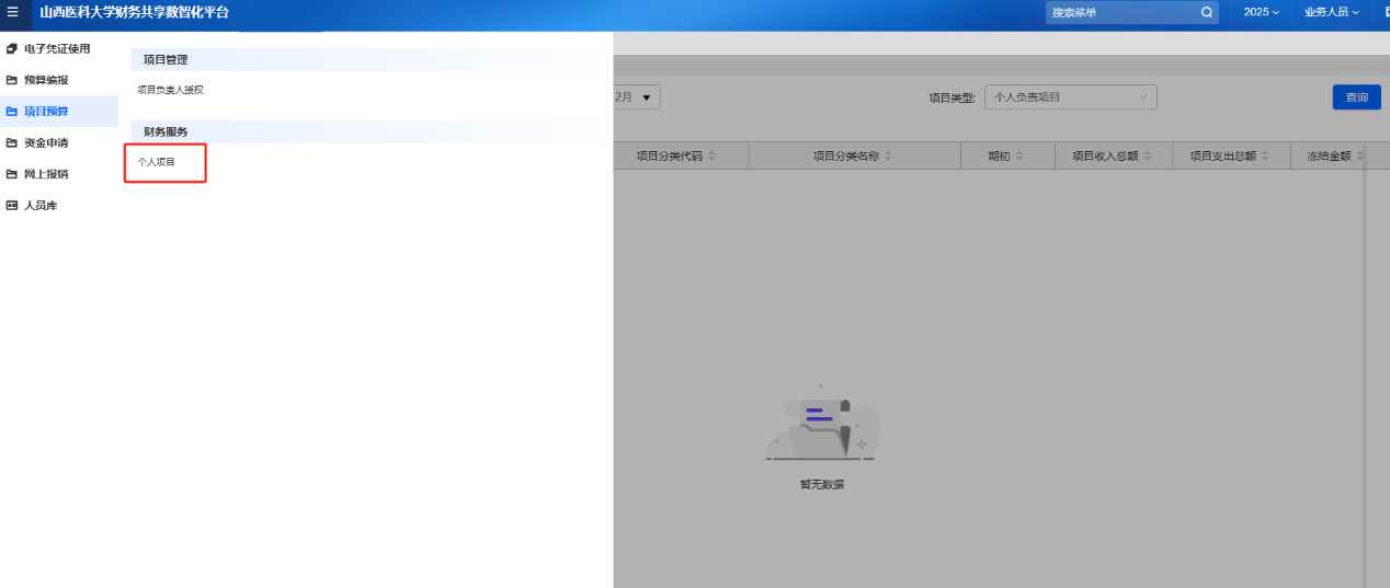 登錄后,在左側(cè)菜單列表中,點(diǎn)擊“項(xiàng)目預(yù)算”→“個(gè)人項(xiàng)目”。