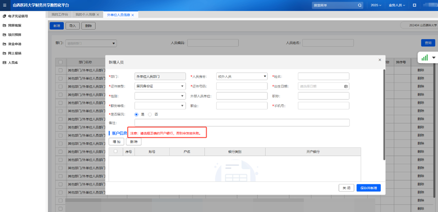 點(diǎn)擊左側(cè)菜單欄中“人員庫”→“外單位人員信息”,可新增校外人員基本信息,用于酬金報(bào)銷。