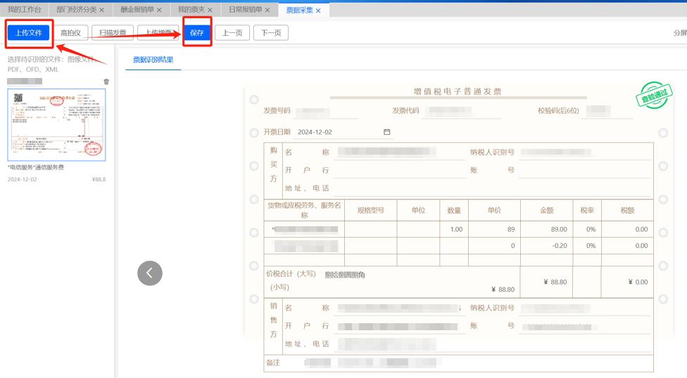 進(jìn)入頁面后點(diǎn)擊上傳文件,查驗(yàn)通過后點(diǎn)擊保存(識別確認(rèn)無誤,折疊票等紙質(zhì)發(fā)票可能存在印章遮擋檢驗(yàn)碼等情況造成查驗(yàn)失敗)。