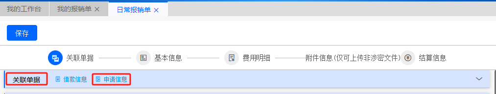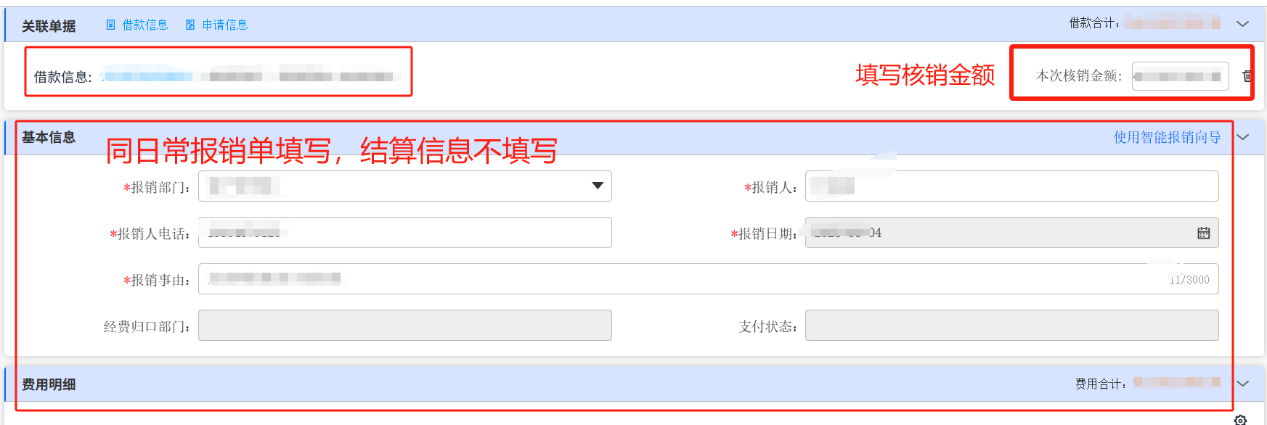 在關(guān)聯(lián)單據(jù)處填寫核銷金額,再按實(shí)際情況填寫費(fèi)用明細(xì)、附件、電子票據(jù)等信息(同日常報(bào)銷單填寫)。結(jié)算信息不填寫,點(diǎn)擊保存即可。