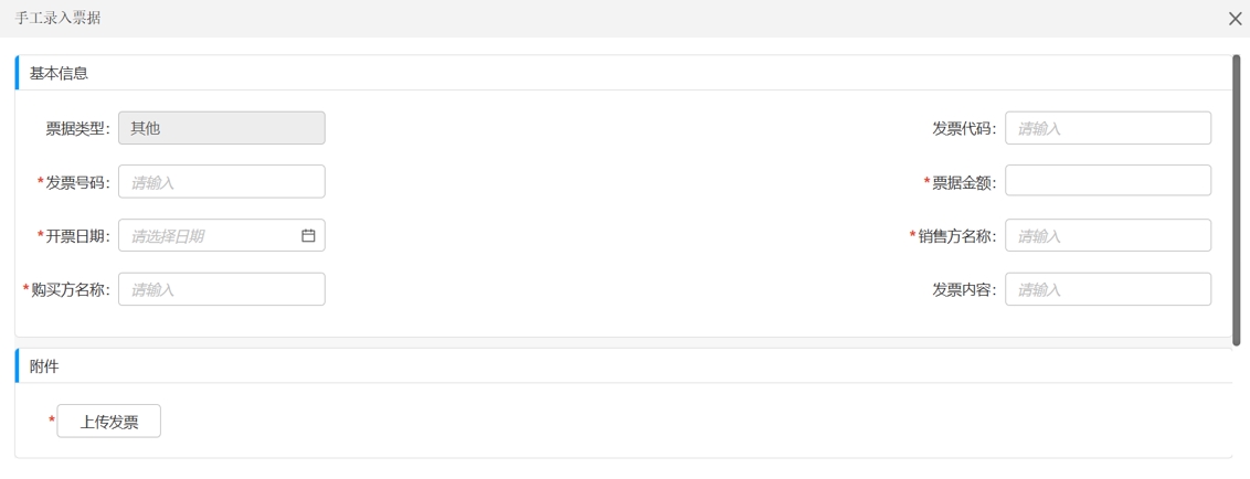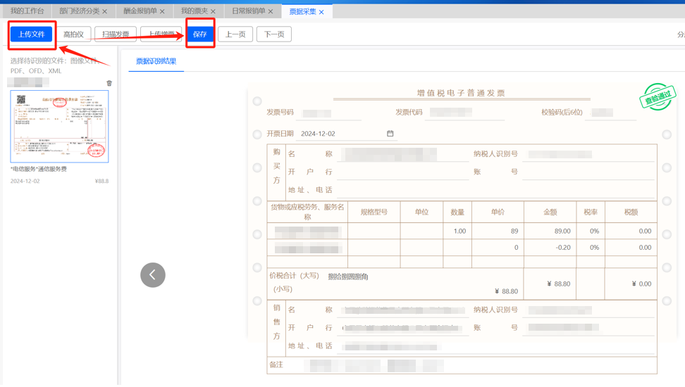 在各費(fèi)用項(xiàng)后方,點(diǎn)擊“智能識別”→“票據(jù)采集”,進(jìn)入票據(jù)采集頁面后點(diǎn)擊“上傳文”,查驗(yàn)通過后點(diǎn)擊“保存”(折疊票等紙質(zhì)發(fā)票可能存在印章遮擋檢驗(yàn)碼等情況造成查驗(yàn)失敗,火車票和機(jī)票行程單必須上傳單次行程票據(jù))如圖: