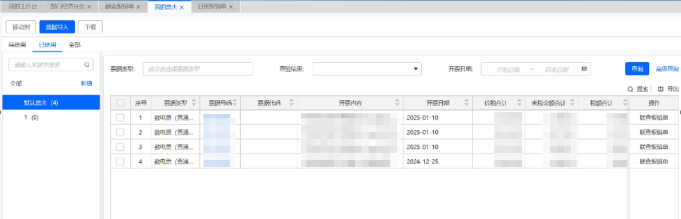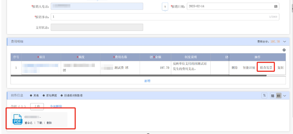 完成關(guān)聯(lián)后,出現(xiàn)聯(lián)查發(fā)票按鈕,點(diǎn)擊可查看發(fā)票情況,打印報(bào)銷單,會(huì)有發(fā)票信息,并自動(dòng)上傳發(fā)票附件。