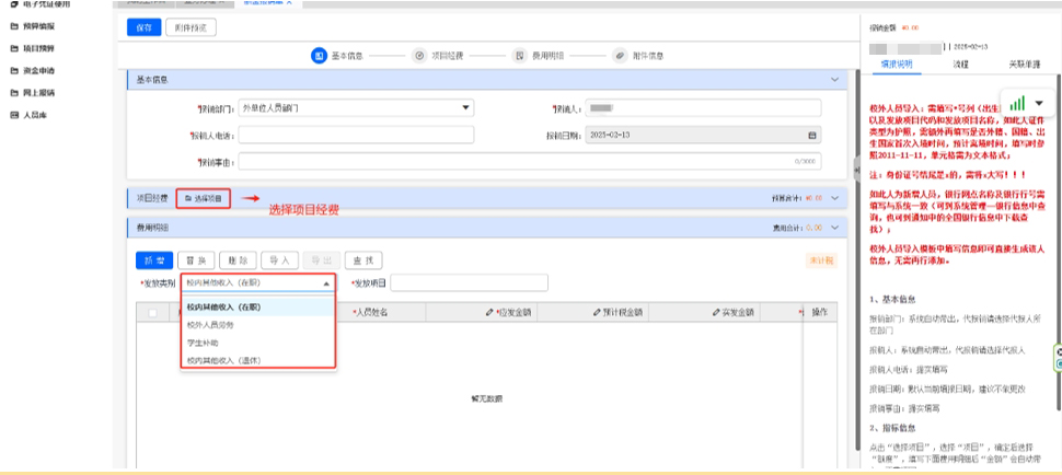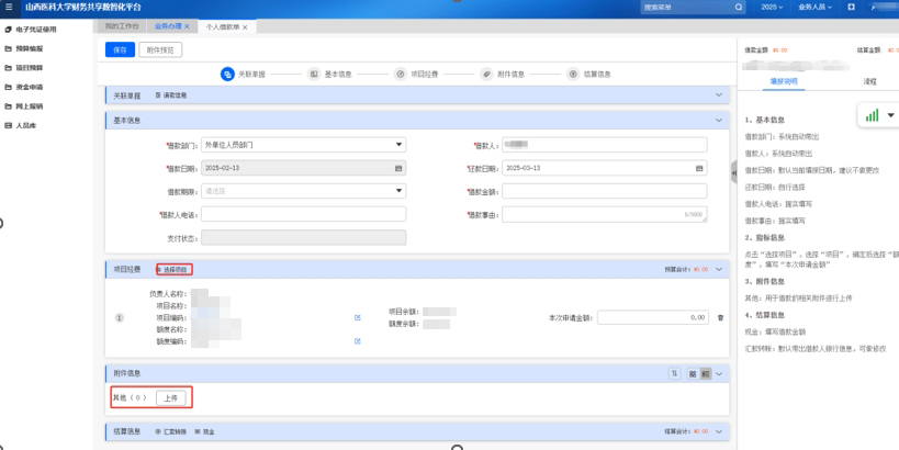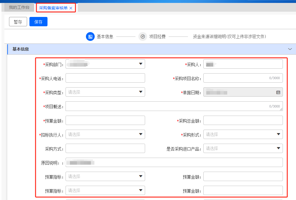 按實(shí)際情況填寫 “基本信息”→“項(xiàng)目經(jīng)費(fèi)”→“資金來源詳細(xì)說明”等信息,帶有*號為必填項(xiàng),線下審批的紙質(zhì)版材料必須上傳。