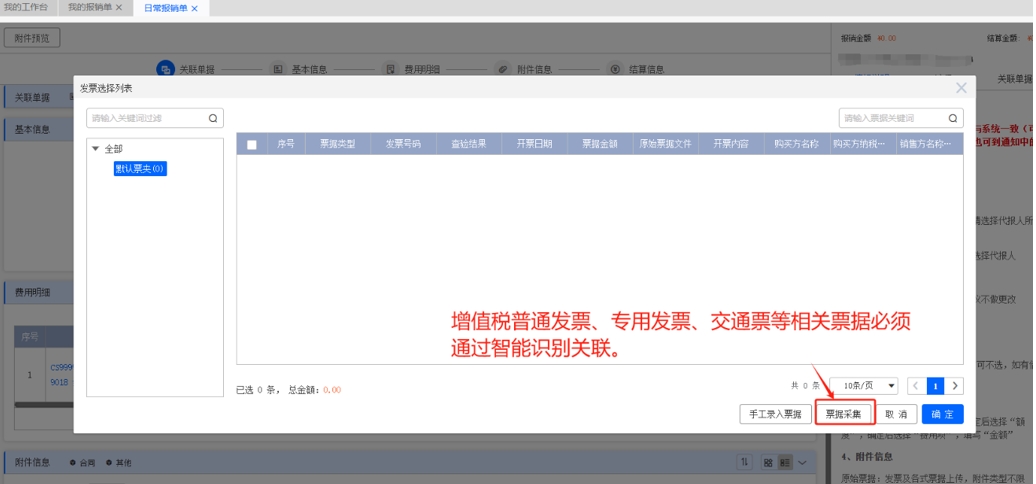 保存后關(guān)閉票據(jù)采集頁面,回到報(bào)銷單中的發(fā)票選擇列表中,點(diǎn)擊全部刷新頁面,勾選識別后的發(fā)票,點(diǎn)擊確定即可完成發(fā)票關(guān)聯(lián)(每個(gè)費(fèi)用項(xiàng)后方的智能識別選擇該費(fèi)用的發(fā)票)。