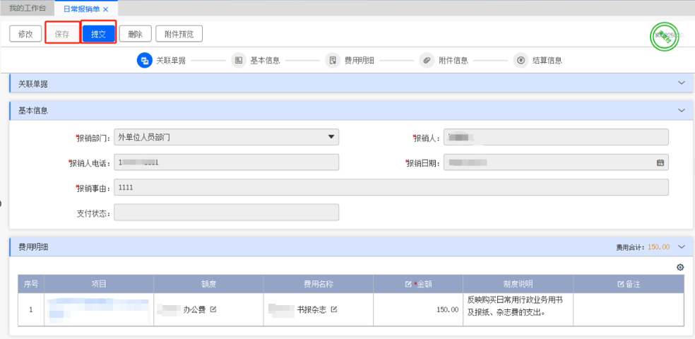 填寫完報(bào)銷單后,進(jìn)行“保存”→“提交”。