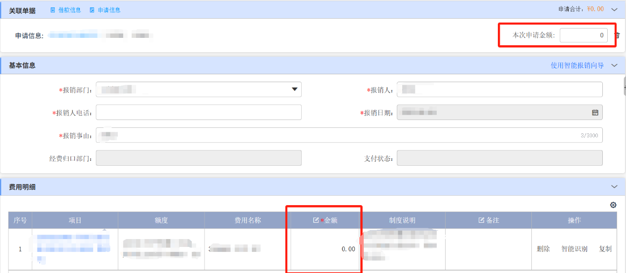 填寫“本次申請金額”,本次申請金額和報(bào)銷金額一致,其他信息按日常報(bào)銷單填寫。