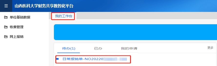 注:除國自然項(xiàng)目外,填報(bào)人提交報(bào)銷單后,需返回“我的工作臺”→“待辦”中點(diǎn)擊想要打印的報(bào)銷單,如圖: