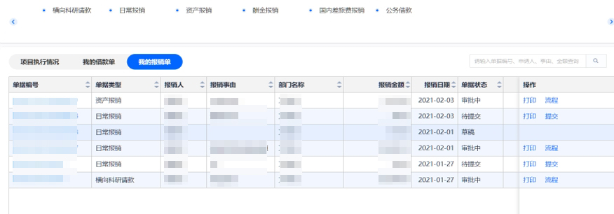 左側(cè)菜單列表,進(jìn)入“網(wǎng)上報(bào)銷” →“我的報(bào)銷單”,在我的報(bào)銷單已提交菜單下,選擇對應(yīng)單據(jù)信息操作列的流程按鈕,可查看此報(bào)銷單的流程審核信息。