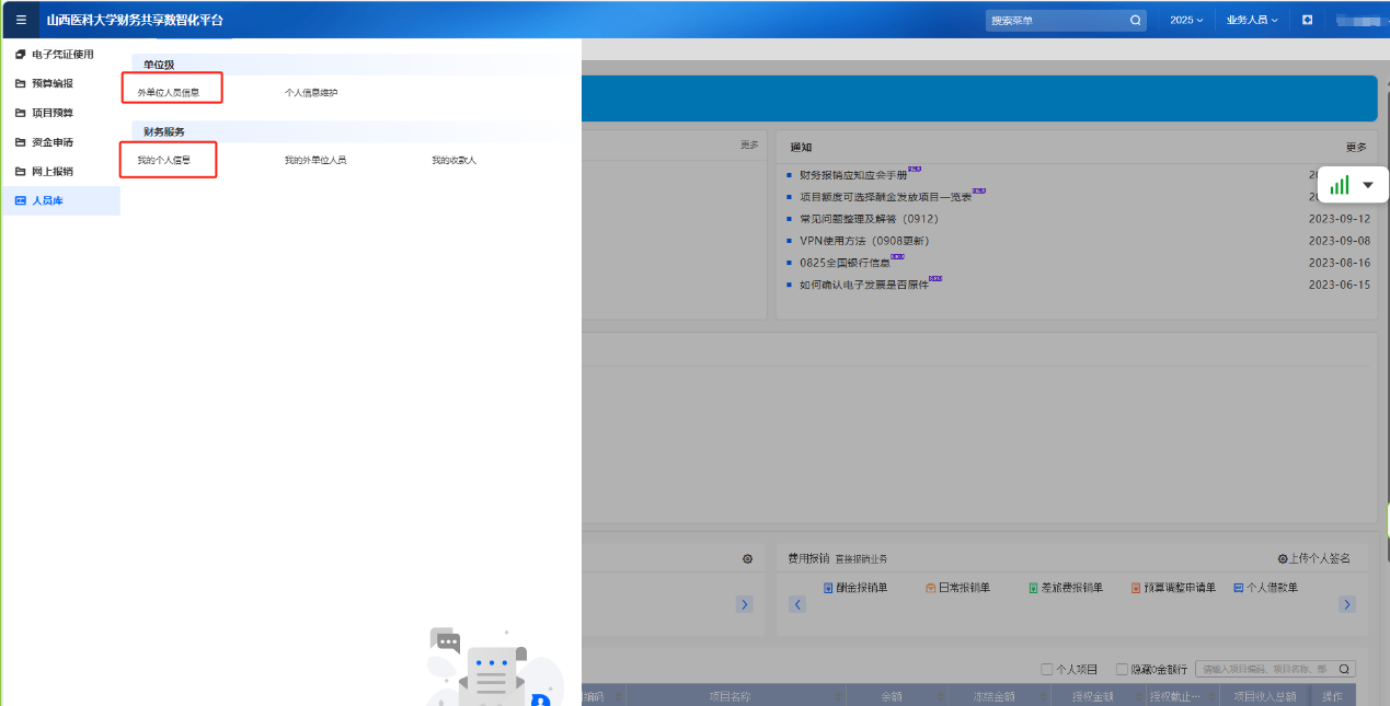 點(diǎn)擊左側(cè)菜單欄中“人員庫”→“我的個(gè)人信息”,可對銀行賬戶、郵箱、聯(lián)系方式等個(gè)人信息進(jìn)行修改。