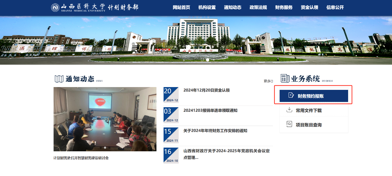 第二種:通過“c7c7.app官網(wǎng)首頁” →“管理機(jī)構(gòu)”→“行政部門”→“計(jì)劃財(cái)務(wù)部”,進(jìn)入c7c7.app計(jì)劃財(cái)務(wù)處網(wǎng)站主頁,點(diǎn)擊右側(cè)的“財(cái)務(wù)預(yù)約報(bào)賬”進(jìn)入系統(tǒng)登錄。