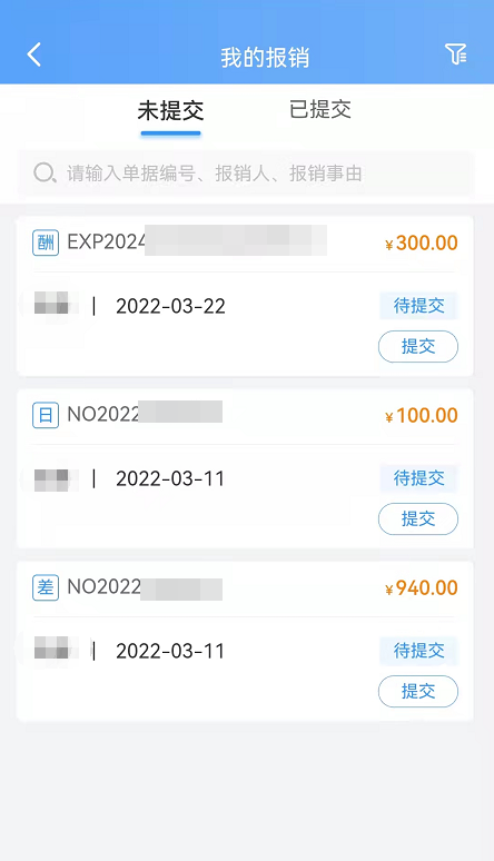 展示本人在pc端填報完成但未提交的報銷申請單,選擇要提交下崗審核的單據,點擊提交按鈕,完成單據提交。