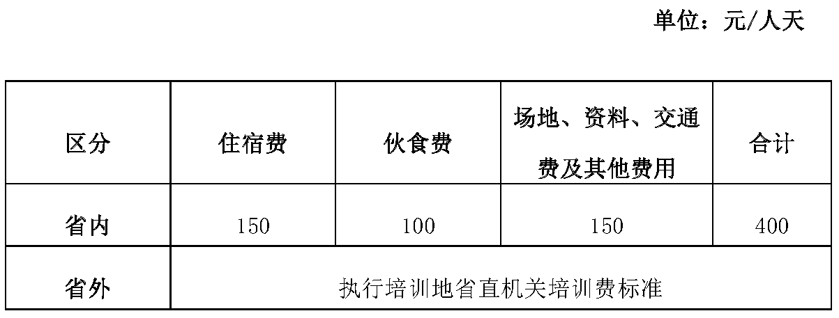 (2)30天以內(nèi)的培訓(xùn)按照綜合定額標(biāo)準(zhǔn)控制;超過(guò)30天的培訓(xùn),超過(guò)天數(shù)按照綜合定額標(biāo)準(zhǔn)的70%控制。上述天數(shù)含報(bào)到撤離時(shí)間,省內(nèi)報(bào)到和撤離時(shí)間合計(jì)不得超過(guò)1天,省外報(bào)到和撤離時(shí)間分別不得超過(guò)1天。