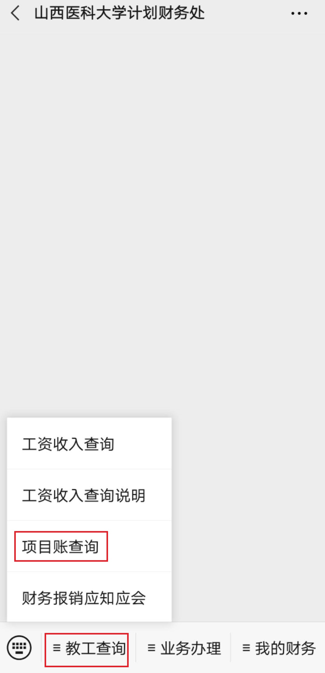 1、打開c7c7.app計(jì)劃財(cái)務(wù)處公眾號(hào),點(diǎn)擊左下角“教工查詢-項(xiàng)目賬查詢”,使用賬號(hào)密碼登錄(同報(bào)賬平臺(tái)),如下所示: